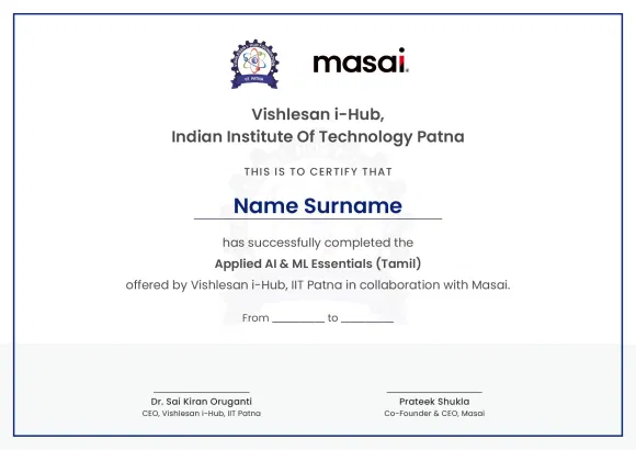 Go from zero to job-ready in AI/ML with beginner-friendly, industry-aligned curriculum from I-Hub IIT Patna, taught in Tamil — covering Python, data analysis, machine learning, and generative AI with hands-on projects. Built for beginners, designed to get you building real things fast.